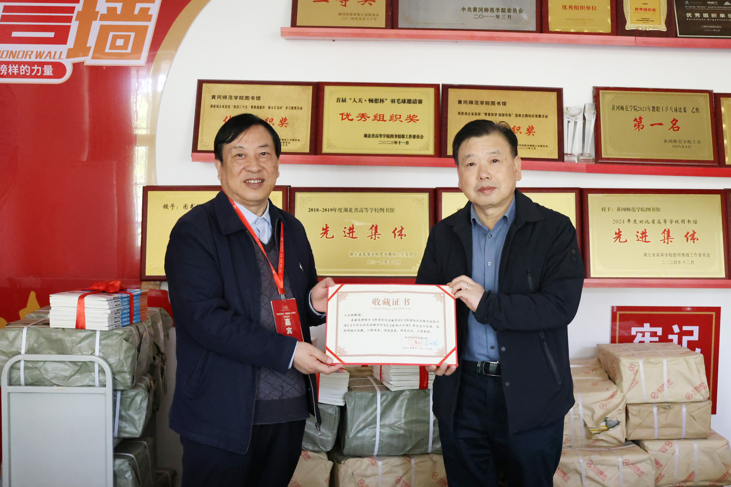 王基家代表学校向王后雄教授颁发收藏证书并致谢。他强调,这批图书凝聚着一线教学智慧,既是馆藏资源的宝贵补充,更是校友赤子情怀与育人担当的生动体现。他要求图书馆妥善保管利用,让书香浸润校园;并呼吁广大校友持续关注支持母校发展,与学校共赴高水平师范大学建设新征程。