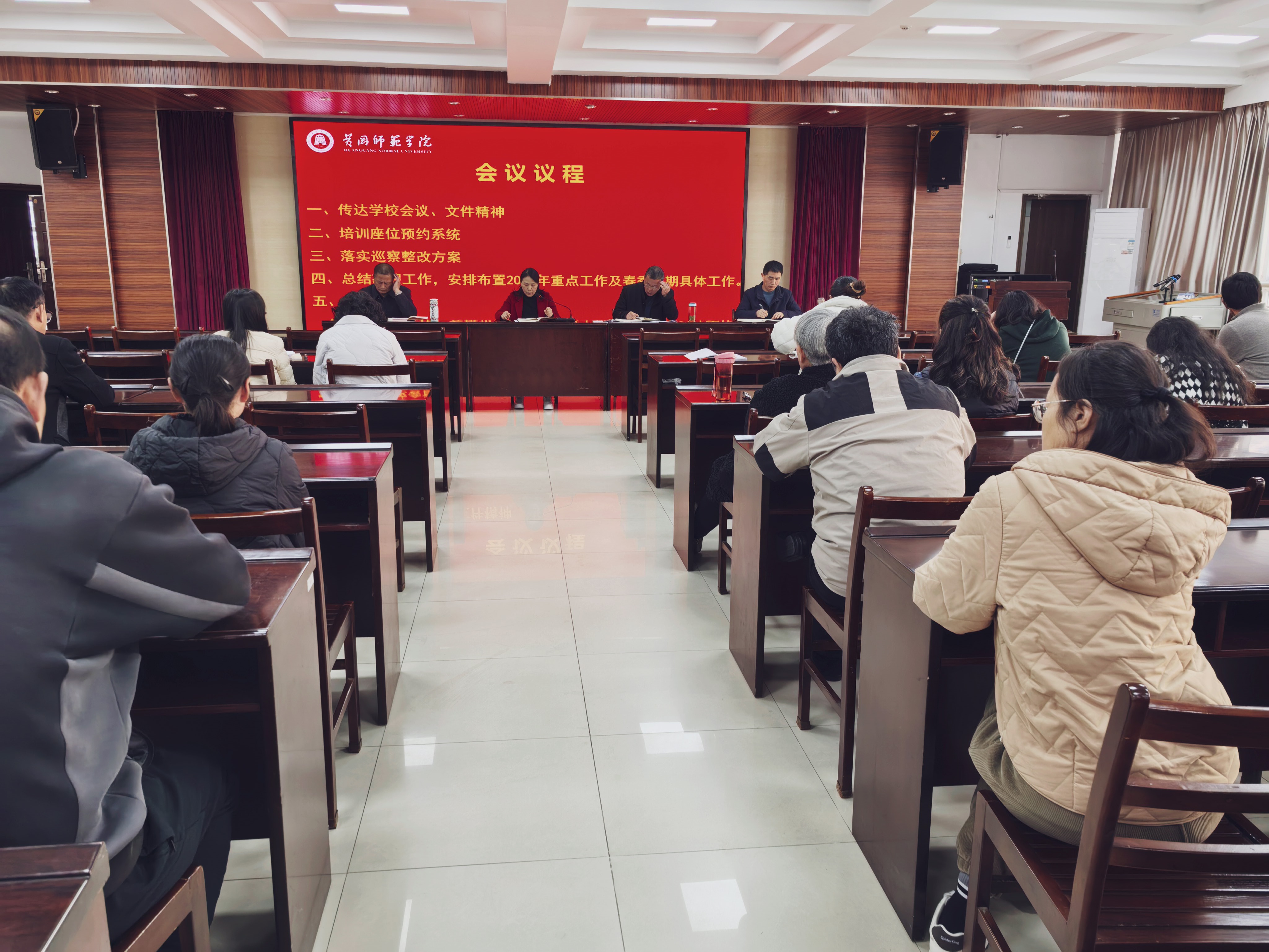 馆长吴恒梅总结寒假期间“策马迎春 阅享新年”阅读推广春节主题活动、线上线下文献传递服务师生、南北馆增设插座勘测服务民生、馆领导带班值班值守确保安全等四项主要工作,全面安排布置2026年扎实开展学习教育、巡察整改,优化资源建设、深化阅读推广,加强座位预约、特藏建设、学科服务,完善设施改造、消防安全等10个方面的重点工作及本学期具体工作。